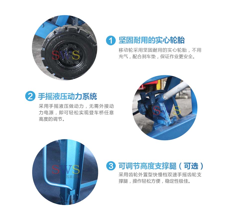 移動輪采用實心輪胎,不用充氣,堅固耐用,配合剎車墊,保證作業(yè)安全。