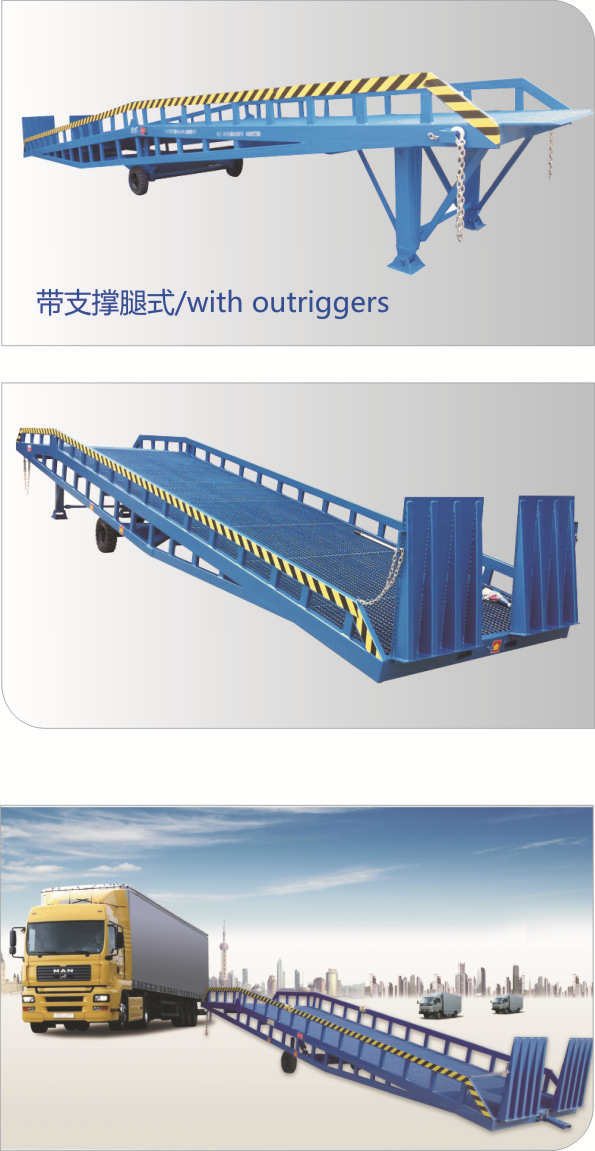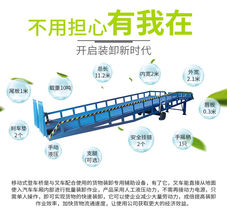 移動液壓登車橋是與叉車配合使用的貨物裝卸專用輔助設備,有了它,叉車能直接從地面進入汽車車廂內(nèi)進行裝卸貨物的作業(yè)。能夠提高貨物裝卸速度,節(jié)省裝卸工作的時間以及人力,是您裝卸貨物的得力助手。只需單人操作,不需動力電源,即可實現(xiàn)貨物的安全快速裝卸。移動式登車橋用于無裝卸設備的貨臺及流動裝卸場所,是與叉車配合使用的貨物裝卸輔助設備??筛鶕?jù)汽車車廂的高低調(diào)節(jié)高度,叉車可以直接通過本設備駛?cè)胲噹麅?nèi)部進行貨物的批量裝裝卸。